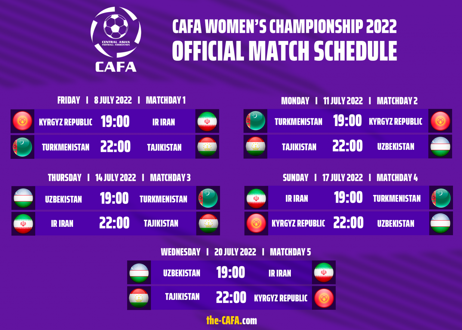 Всего в рамках чемпионата CAFA-2022 среди женских национальных сборных будут сыграны десять матчей. Все игры будут проходить на Центральном стадионе Душанбе.