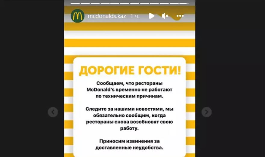 "Сообщаем, что рестораны McDonald’s временно не работают по техническим причинам. Следите за нашими новостями, мы обязательно сообщим, когда рестораны снова возобновят свою работу", – говорится в официальном сообщении в аккаунте.