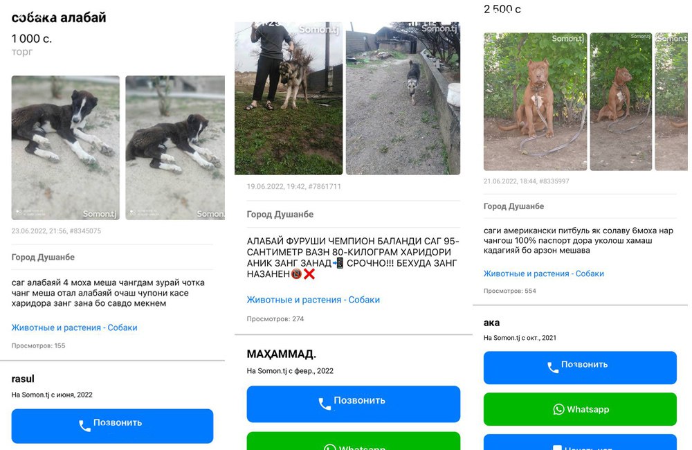 «Мы против насилия над животными» — с таким официальным обращением таджикский сайт somon.tj отреагировал на просьбу зоозащитников не пропускать объявления о продаже собак для собачьих боев. Администрация сайта удалила все существующие объявления, где был подобный контент.