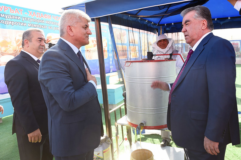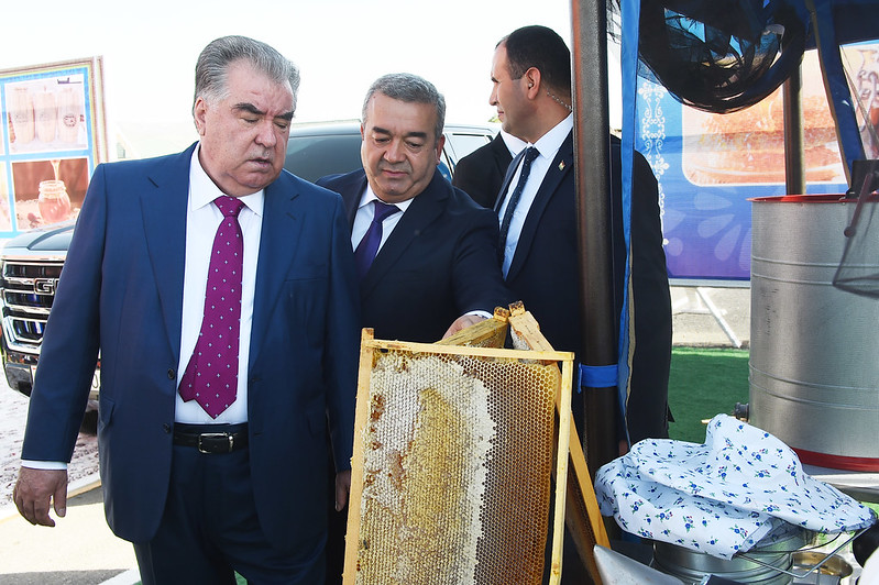 Далее президент посетил постоянно действующую выставку-продажу лекарственных цветов и трав и приготовленного из них лекарственного сырья в джамоате Джомбахт Ховалингского района.