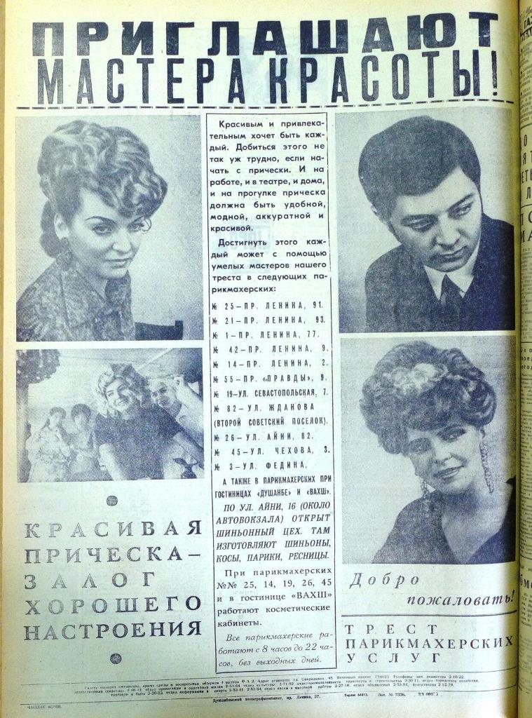 Важно упомянуть, что во всех упомянутых парикмахерских, цены были весьма приемлемыми. Дело в том, что прейскурант утверждался на государственном уровне и мог отличаться лишь с небольшими поправками. Например, постриженные усы или модельная стрижка обошлись бы вам в 40 копеек за услугу. В женском зале модная в 70-х годах стрижка по методу «сассон» в среднем стоила 1 рубль 60 копеек, завивка волос на бигуди — 80 копеек. А чтобы получить полный комплект из химической завивки и стрижки, душанбинским красавицам приходилось расставаться почти с 5 рублями.