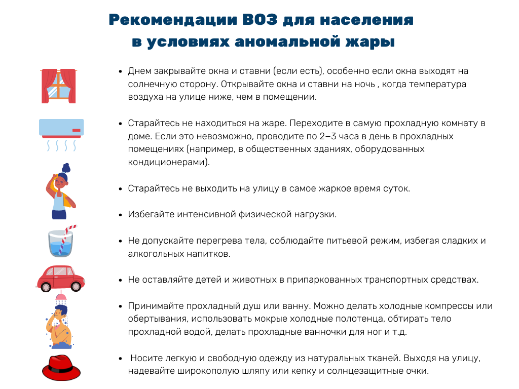 При воздействии высокой температуры окружающего воздуха человеческий организм старается усилить теплоотдачу с целью сохранения собственного теплового баланса, говорит врач-терапевт из Душанбе Оксана Гончарова. Это происходит за счёт усиленного потоотделения. Также при длительном пребывании в условиях жары повышается температура тела, учащается пульс, понижается функциональная активность желудочно-кишечного тракта (ЖКТ), ухудшается нормальная работа сердечно-сосудистой системы (ССС).