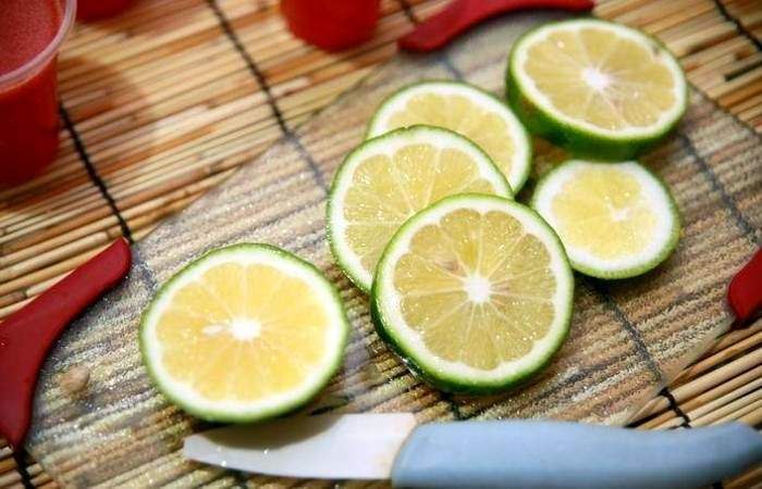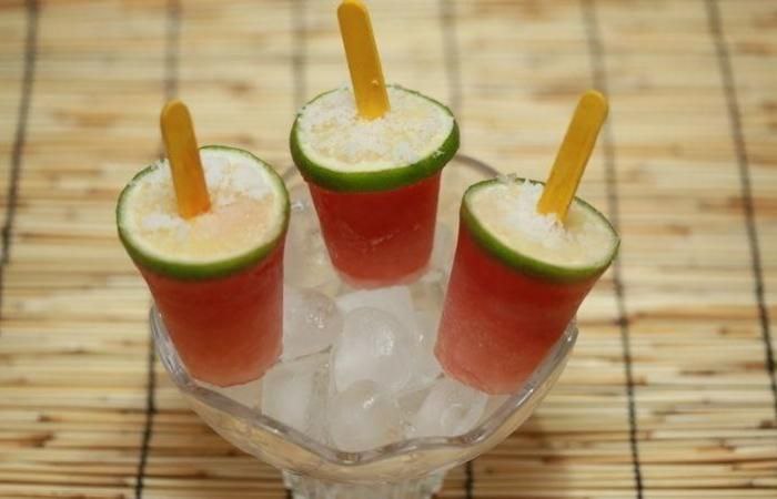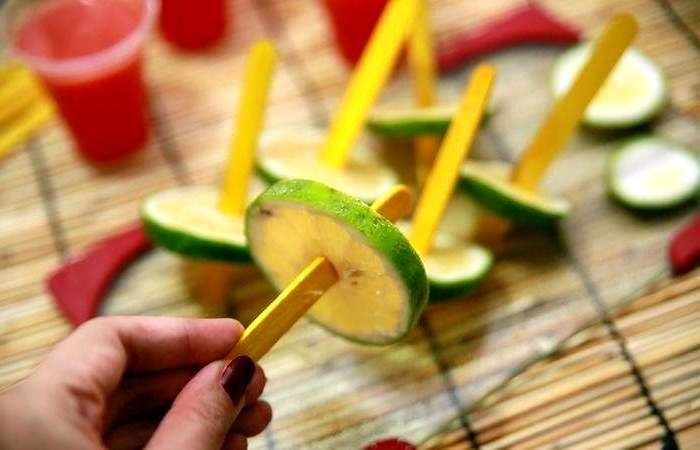 Лайм нарежьте кружочками, проткните каждый кружочек палочкой и поместите по одному кружочку с палочкой в каждый стакан с арбузной смесью. Отправьте в морозилку для заморозки на 7-8 часов. Затем выберите мороженое из формы и подайте на стол.