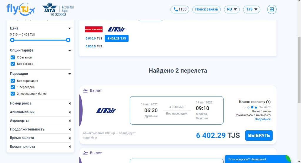 Авиакомпания «ЮТэйр» предлагает пассажирам добраться из Душанбе до Москвы за 33 тыс. — 37 тыс. рублей (от 5 тыс. 431 до 6 тыс. 90 сомони).