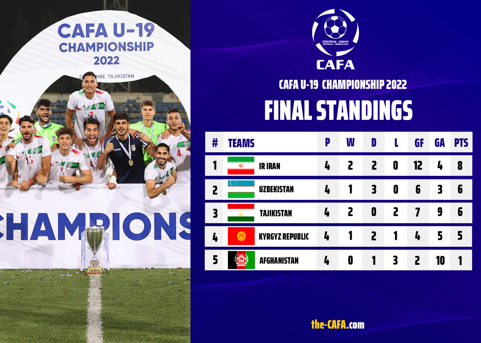 Таким образом, по итогам турнира молодежная сборная Ирана набрала 8 очков и стала победителем чемпионата Центрально-Азиатской футбольной Ассоциации. Сразу две команды –Узбекистан и Таджикистана набрали одинаковое количество очков – по 6. Однако за счет победы в личной встрече серебряные медали достались сборной Узбекистана.