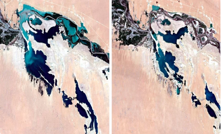 На снимках наглядно можно видеть последствия трех подряд маловодных лет. Водохранилища Туюмуюнского гидроузла на снимке 7 августа 2019 года в разы меньше по площади, чем на снимке от 13 августа 2022 года (справа).