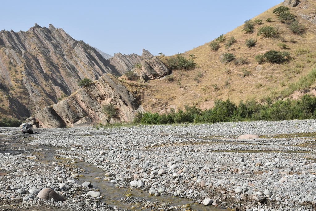 По руслу такой же речки, как Чагам в соседнем ущелье, идет разбитая дорога в сторону отдаленного кишлака Кабок.