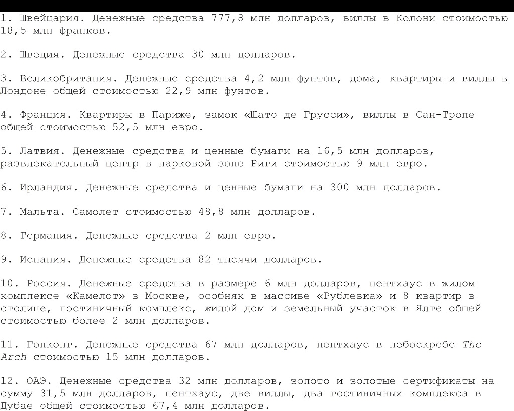 По подсчетам Генпрокуратуры, зарубежные активы Каримовой составили около 1,4 млрд долларов, 63,5 млн евро, 21 млн фунтов и 18,5 млн швейцарских франков.