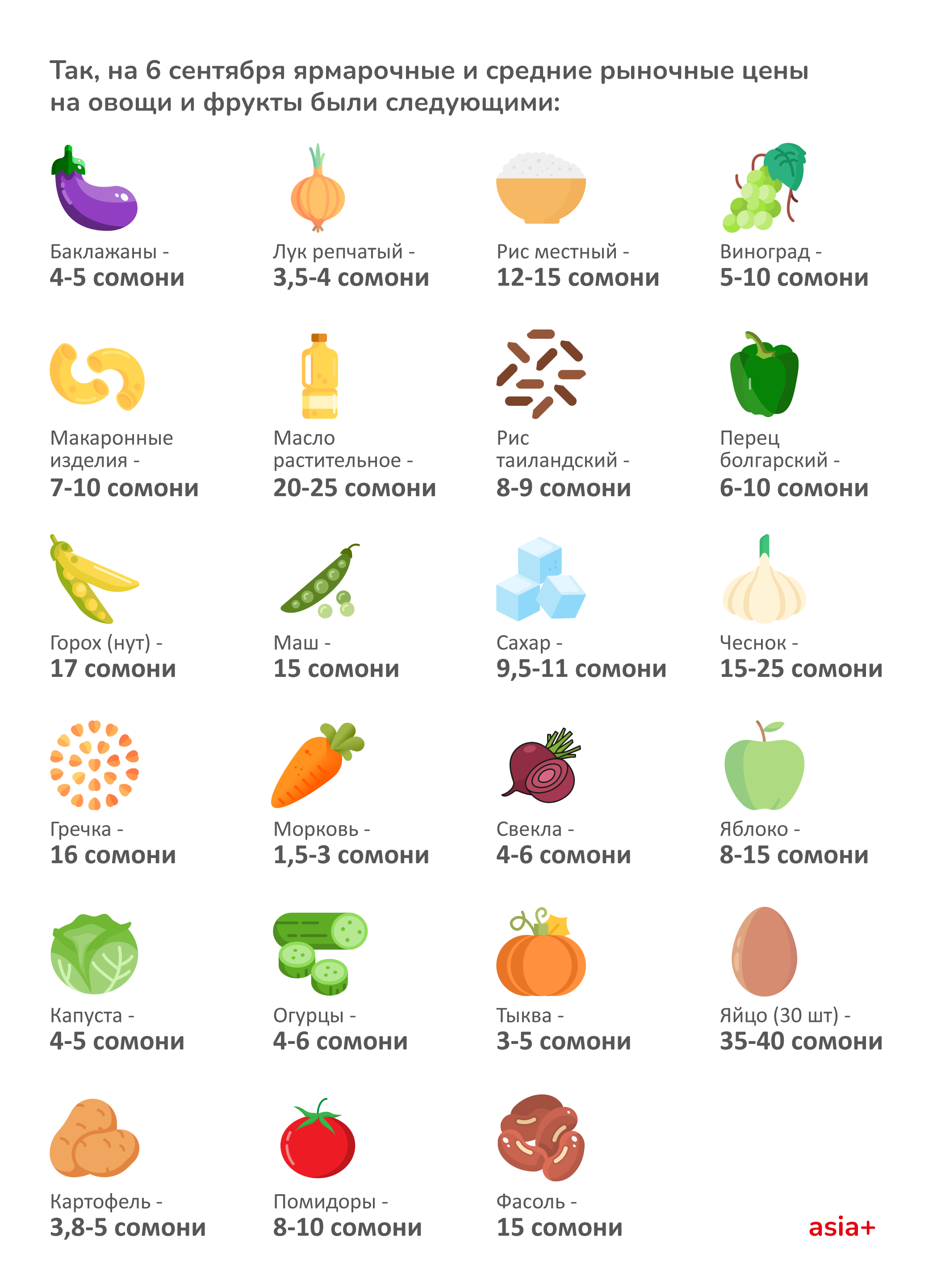 В Таджикистане существенно снизились цены на ряд продуктов, в том числе на муку, масло и сахар. По сравнению с началом августа цена за 50-килограммовый мешок муки 1 сорта в Душанбе снизилась от 360 до 290 сомони на ярмарках, и до 340 на рынках.