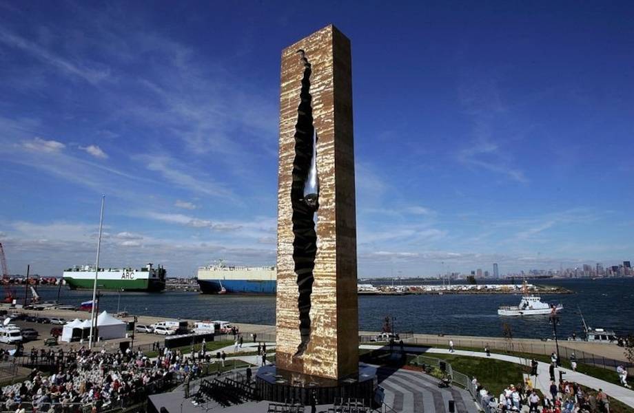 Он представляет собой расколотую бронзовую плиту, символизирующую рухнувшие «башни-близнецы». Внутри трещины подвешена 12-метровая стальная капля – слеза.