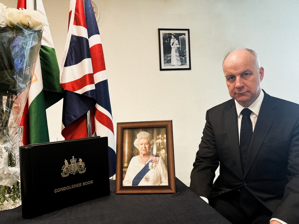 Посольство Великобритании в Таджикистане также справляет национальный траур по Королеве: британский флаг приспущен, коммуникационная активность в соцсетях приостановлена, в одежде сотрудников доминируют темные цвета, а в самом посольстве открыта Книга Соболезнований.