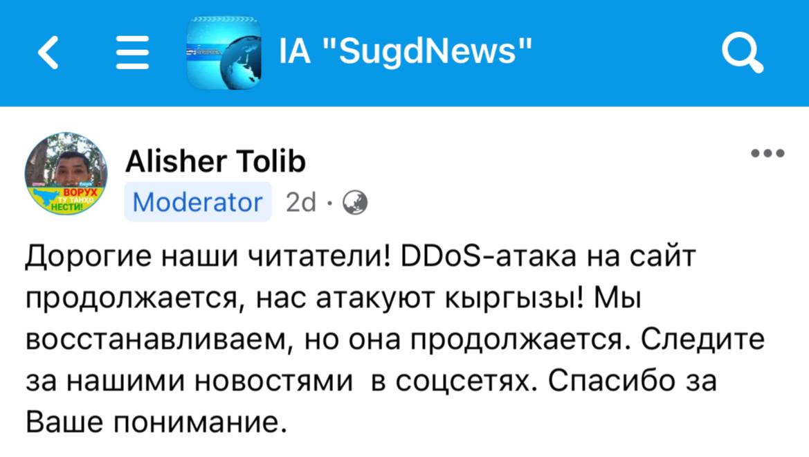 По словам редактора Sugdnews Алишера Толиба, их сайт также подвергся атаке "достаточно серьезного уровня", к которой они не были готовы. по его словам, с такой атакой они столкнулись впервые.