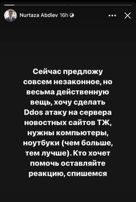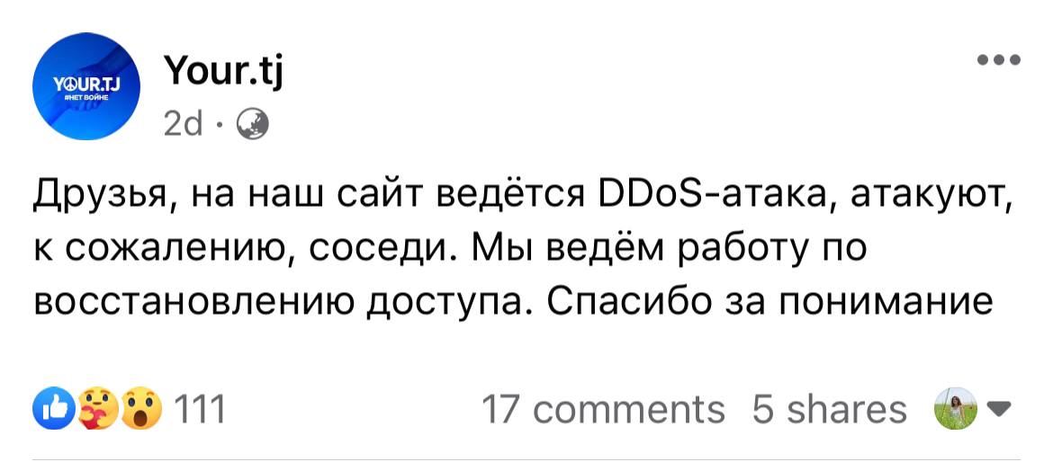 "Атака на наш сайт Your.tj началась 18 сентября, после обеда. На тот момент я вообще не думала о том, что атака может исходить от наших соседей, пока мои ребята не стали присылать ссылки на посты активистов из Кыргызстана, где они призывали объединяться, чтобы атаковать наши сайты. Стабилизировать сайт мы смогли только через сутки, установив на него cloudflare + ddos. Вообще, этим вопросом мы ранее занимались слабо, так как мы пишем в основном о людях, и такие сайты, как наш обычно хакерам не интересны. Но мы ошиблись. Сейчас проблема решена, но вопрос безопасности сайта все равно остается актуальным и мы намерены дальше работать над этим вопросом", — говорит главный редактор Your.tj Зебо Таджибаева.