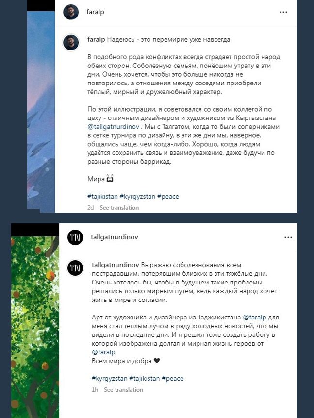 «Мне очень хотелось хоть как-то сбавить уровень напряжения между двумя народами. В субботу пришла идея коллаборации с моими друзьями — графическими дизайнерами Кыргызстана, а также собрать наших таджикских художников. Я понимал, что ребята так же за мир, но волнение написать всё же было. У меня был повод — день рождения Талгата, которого я первым разбудил, наверное, поздравительными сообщениями и вопросом о готовности коллаборации, — написал Фаррух на своей странице в Facebook.
