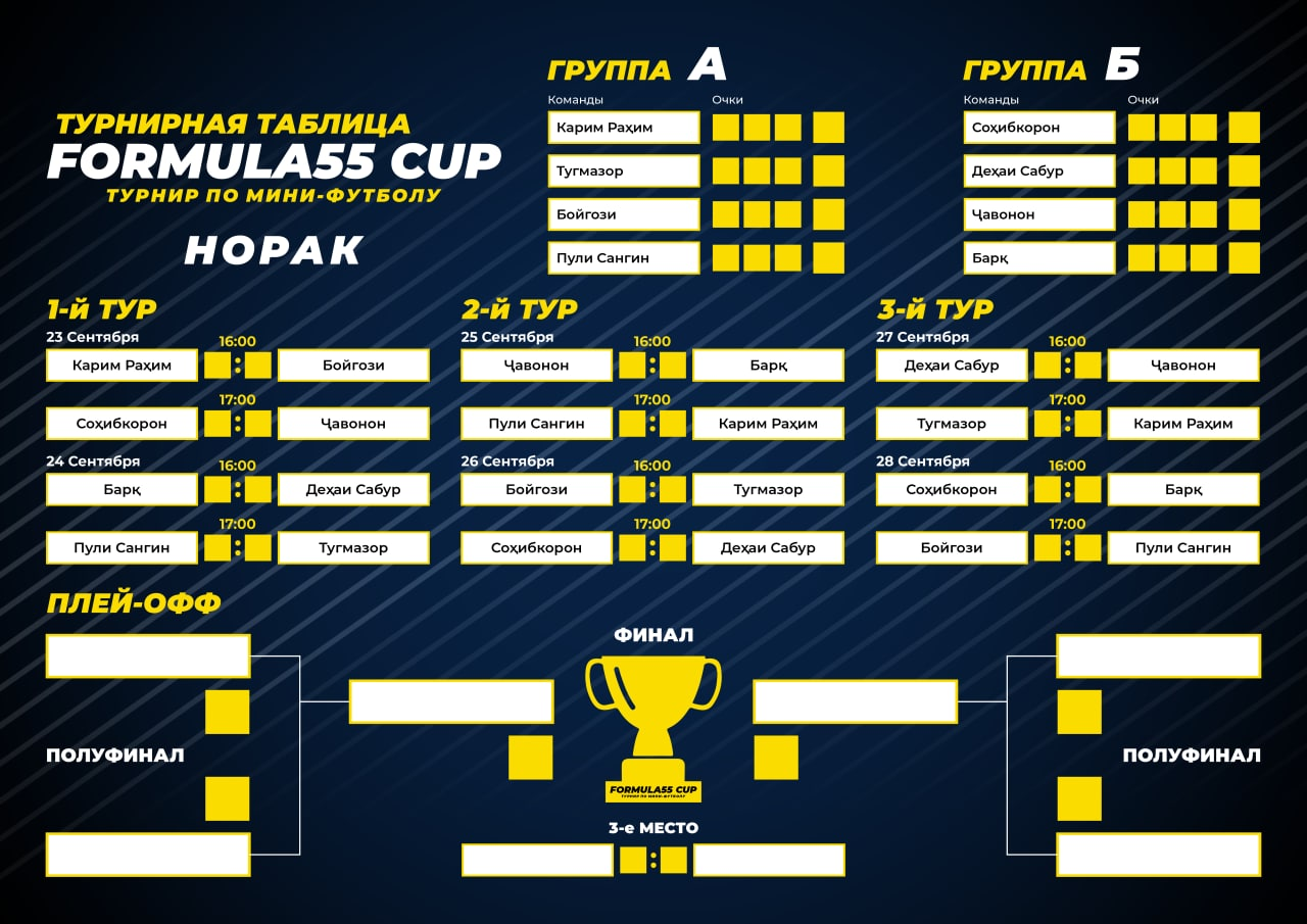 Игры пройдут в Худжанде, Турсунзаде, Нуреке, Бохтаре и Кулябе. Ранее в этих городах, кроме Бохтара, уже состоялись церемонии жеребьёвки команд, участвующих в турнире и были определены соперники. В Бохтаре жеребьёвка состоится 1 октября, ну а первые матчи стартуют в этом городе с 2 октября. В городах Нурек, Турсунзаде и Куляб первые матчи между командами по турниру «Formula55 CUP» стартовали уже сегодня.
