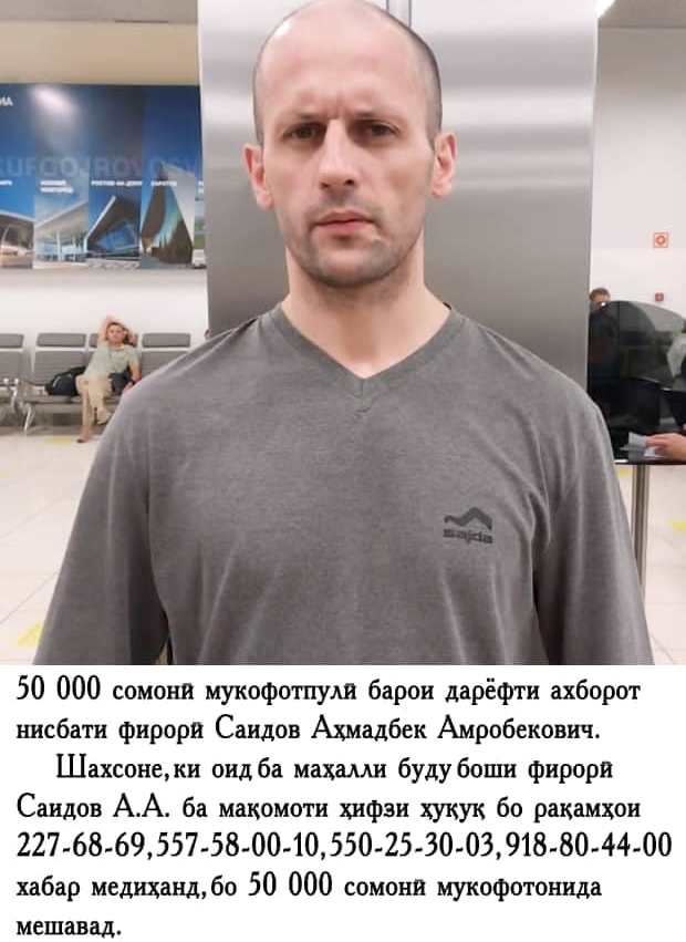 Также в социальных сетях опубликованы фото Ахмедбека Саидова и внизу стоит объявление о выплате 50 000 сомони в качестве вознаграждения за предоставление информации и номера телефонов.