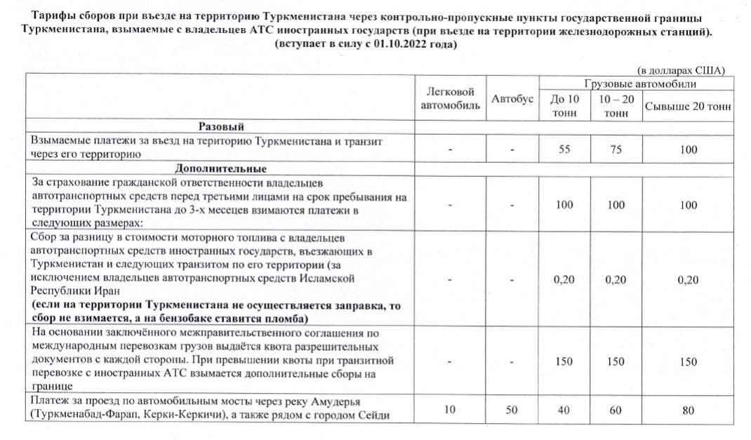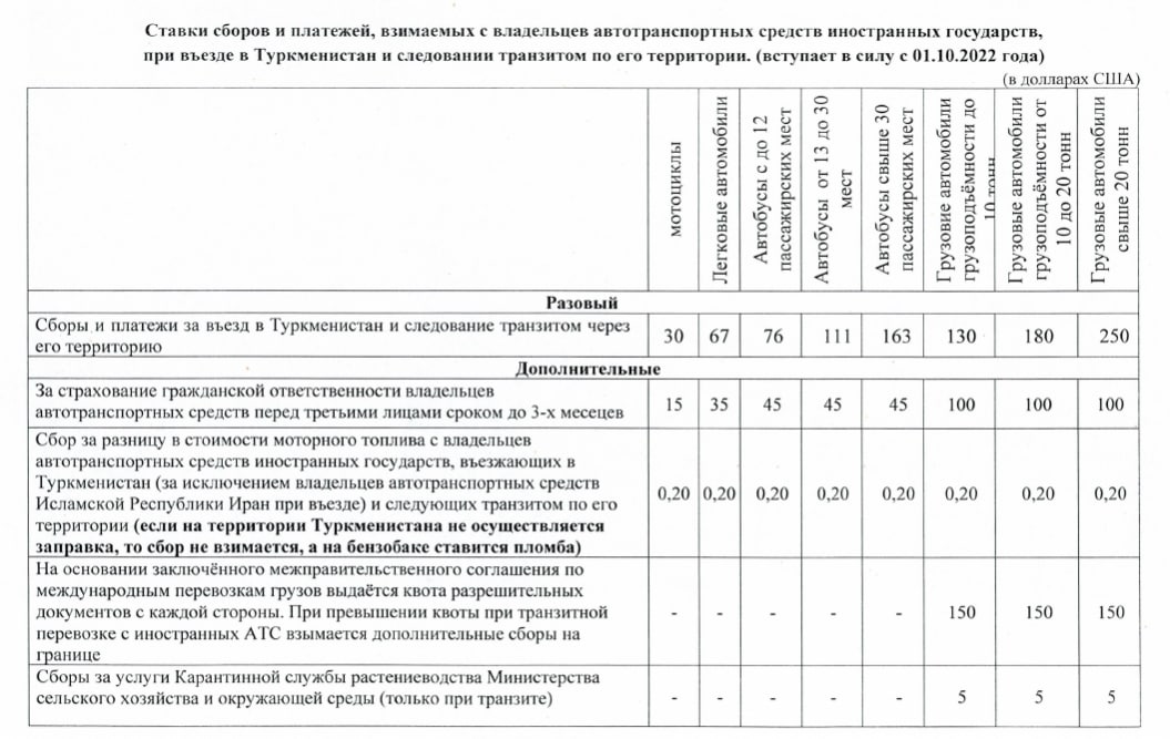 «Изменения введены согласно постановлению президента Туркменистана №257 от 14 сентября 2022 года «О регулировании деятельности государственных органов на таможенной границе Туркменистана и установлении единого размера сборов и платежей с иностранных владельцев автотранспортных средств», — говорится в сообщении.