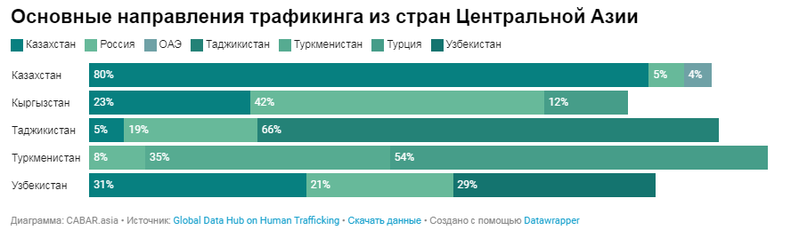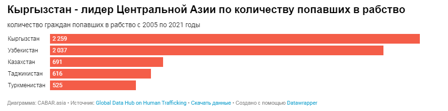 Согласно информации Глобального центра данных о торговле людьми (Global Data Hub on Human Trafficking), с 2005 по 2021 годы более 6 тысяч граждан стран Центральной Азии оказывались в сексуальном, трудовом или другом рабстве.