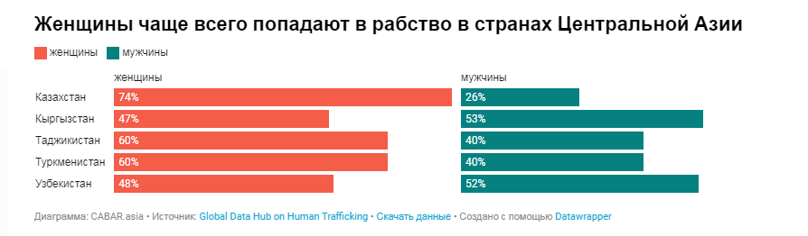 В среднем, по данным Глобального центра данных о торговле людьми (Global Data Hub on Human Trafficking), около 60% граждан стран Центральной Азии, оказавшихся в рабстве, — это женщины.