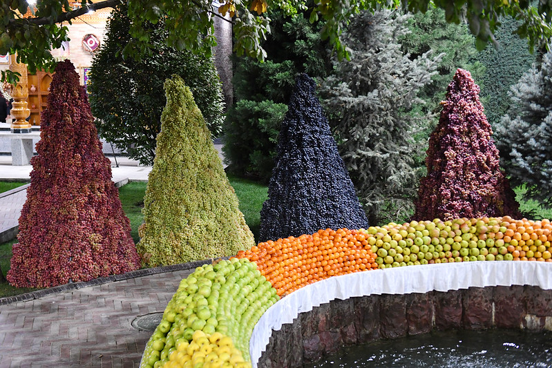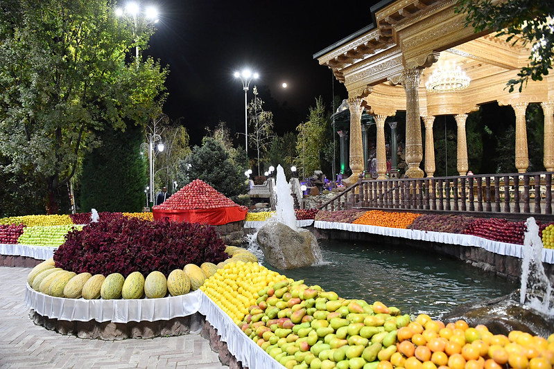 Сначала главы государств прогулялись по резиденции, где также была организована выставка сельскохозяйственной продукции и национальных блюд Таджикистана.