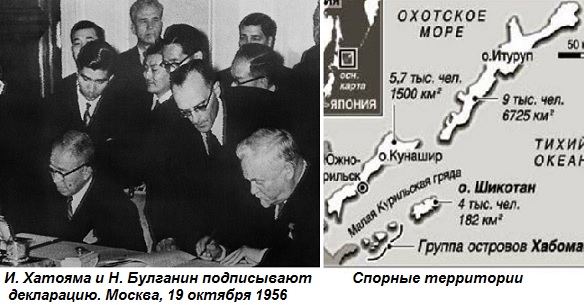 19 октября 1956 года в Москве подписана Совместная советско-японская декларация о прекращении войны и восстановлении дипломатических отношений. Страны подтвердили, что в своих отношениях будут руководствоваться принципами Устава ООН, обязались не вмешиваться прямо или косвенно во внутренние дела друг друга.