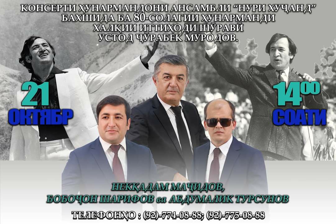 Во Дворце культуры Айнинского района 21 октября в 14:00 состоится Концерт артистов Ансамбля "Нури Худжанд", посвященный 80-летию Народного артиста СССР Джурабека Муродова.