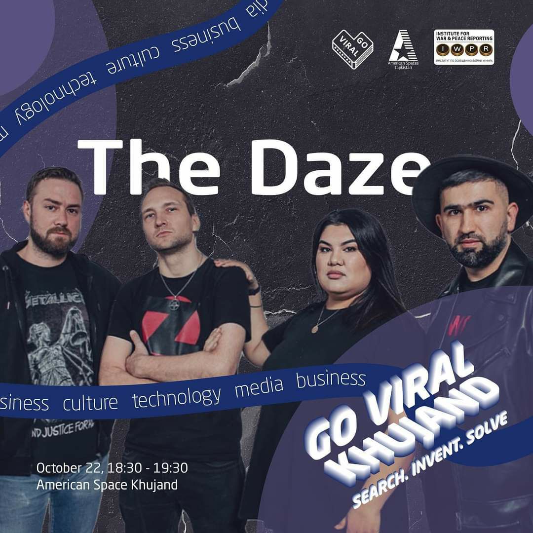 В American Space Khujand 22 октября в 18:30 выступит рок-группа из Душанбе с композициями на таджикском, русском и английском языках. Их треки есть на Spotify, iTunes и Youtube. А жители Согда могут послушать их музыку вживую на масштабном мероприятии Go Viral Sughd.