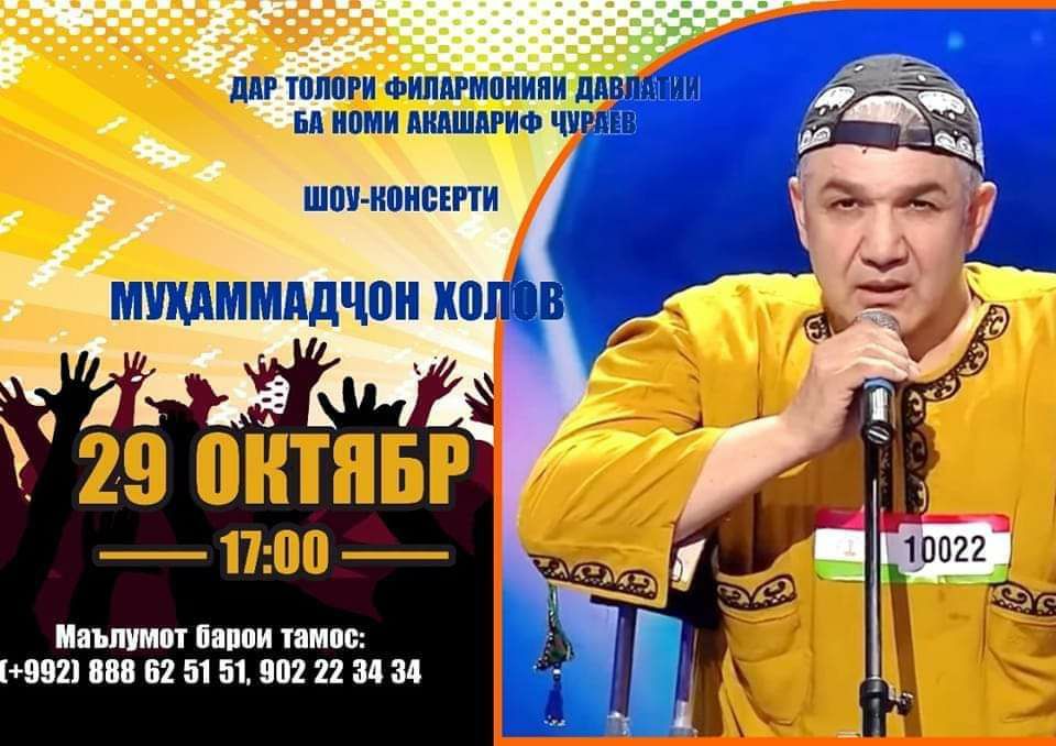 — В Госфилармонии им. А. Джураева в 17:00 состоится концерт Мухаммадджона Холова – певца, который заставил зрителей плакать на вокальном конкурсе Central Asia’s Got Talent во время исполнения собственной песни «Одамон». Когда-то Мухаммадджон был известным таджикским комиком с псевдонимом «Мадонна». Однако в сентябре 2005 года его сбил автомобиль, в корне изменив привычный уклад жизни.
