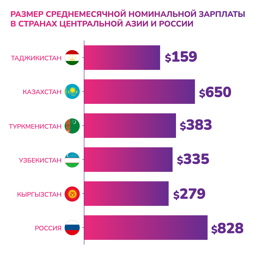 …Размер среднемесячной номинальной зарплаты в странах Центральной Азии и России (реальная зарплата определяется с учетом инфляции) находится в постоянном изменении, данные по Таджикистану – на конец августа, Узбекистану — на конец сентября, а по остальным странам – на конец первого полугодия.