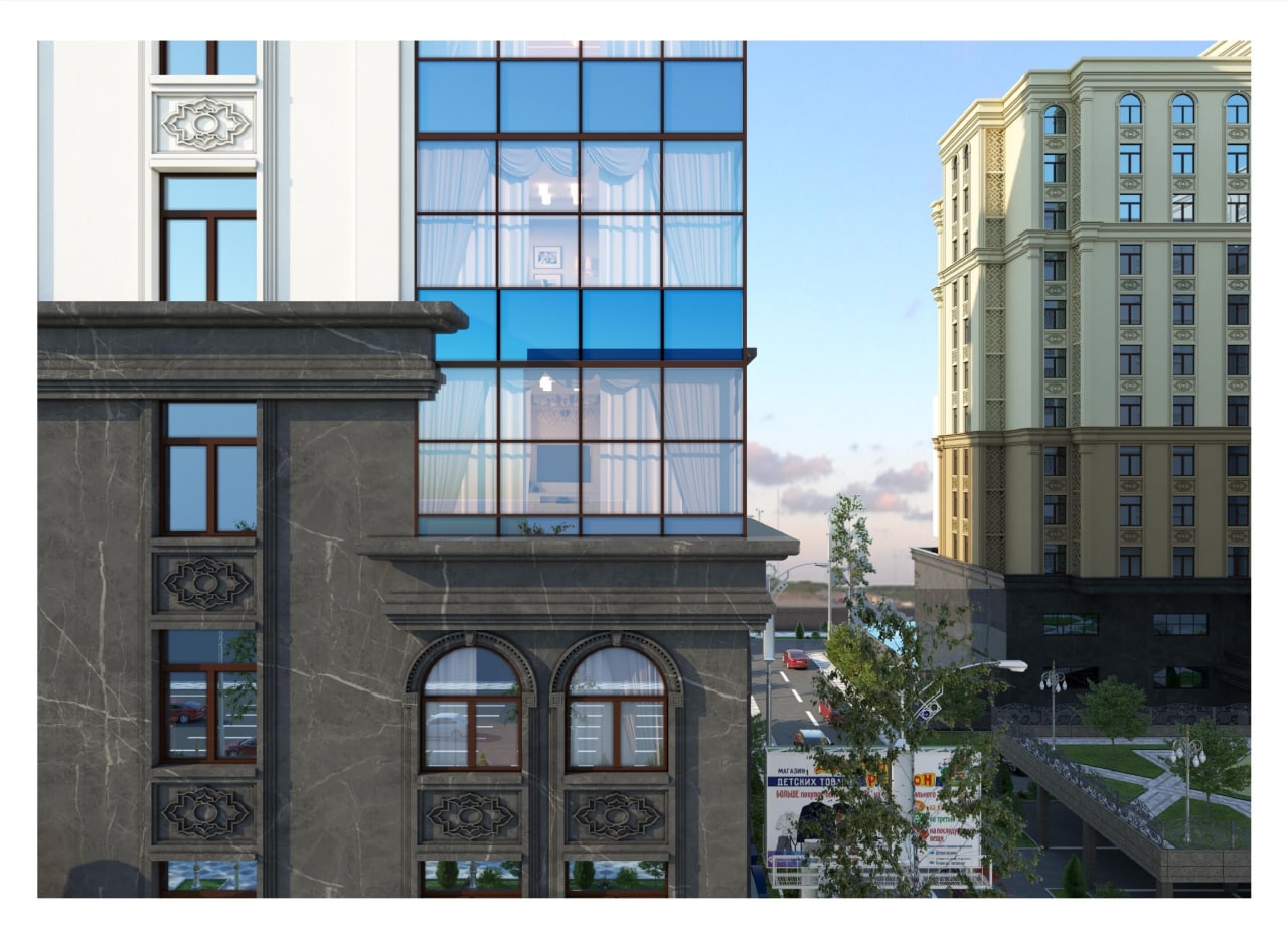 Всего в жилом комплексе 18 этажей, 1 и 2 этаж которого занимают торговые помещения и удобная для жильцов инфраструктура, а с 3 по 18 этажи – жилые квартиры. Жильцам верхних этажей доступен вид на город благодаря просторному панорамному остеклению.