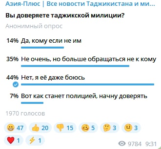 Вы можете проголосовать тут. Ставьте лайк, если вы согласны с исследованием «Индекс закона и порядка» в том, что таджикская милиция работает хорошо и дизлайк, если это вовсе не так.