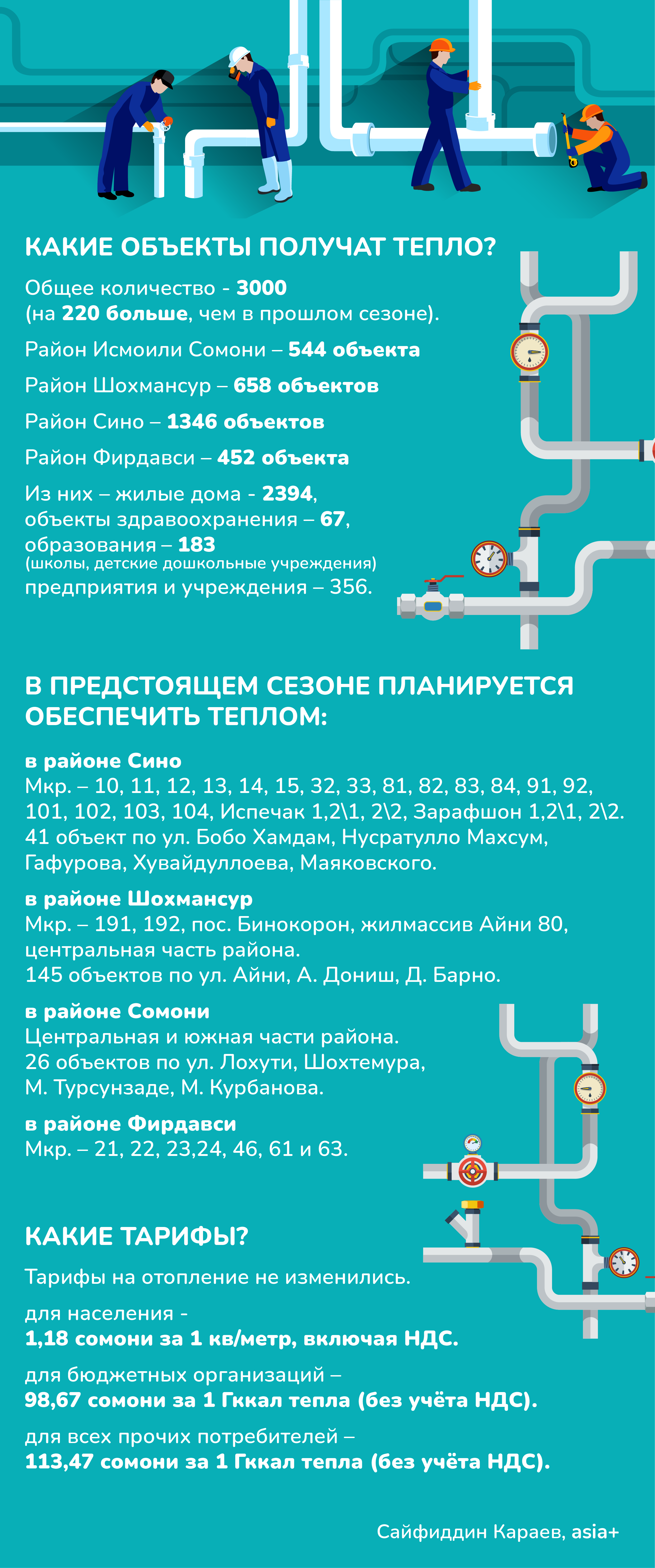 По плану в этом году теплом будут обеспечены 2 762 объекта: 2 211 жилых домов, 64 медучреждения, 172 школы и садики, 315 предприятий и организаций. Всего к отоплению подключены 1297 объектов в районе Сино, 512 – в районе Шохмансур, 510 – в Сомони, 443 – в Фирдавси.