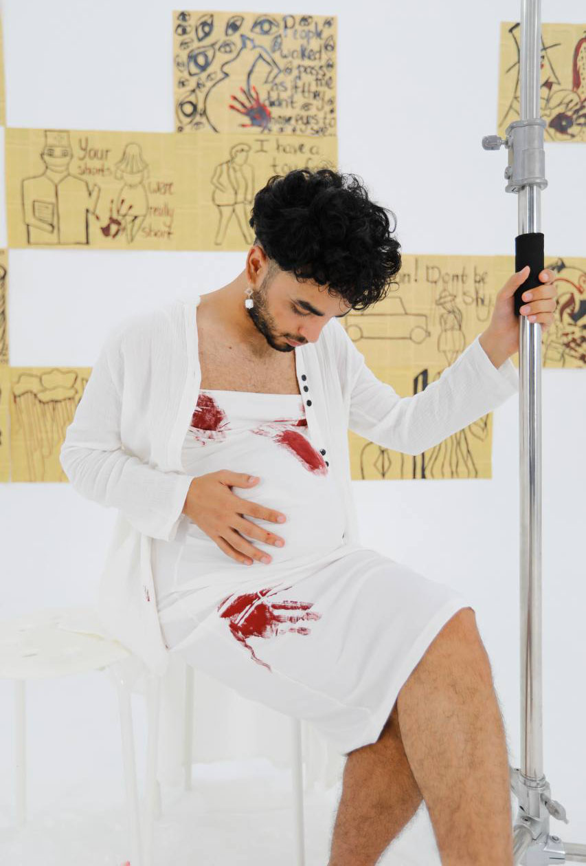 Так как я люблю искусство, у меня появилась идея показывать проблемы, с которыми сталкиваются женщины, именно через него. И смотря, читая все опубликованные истории, я нарисовал 20 картинок, затем уже начал думать, как я могу их показать через перфоманс.
