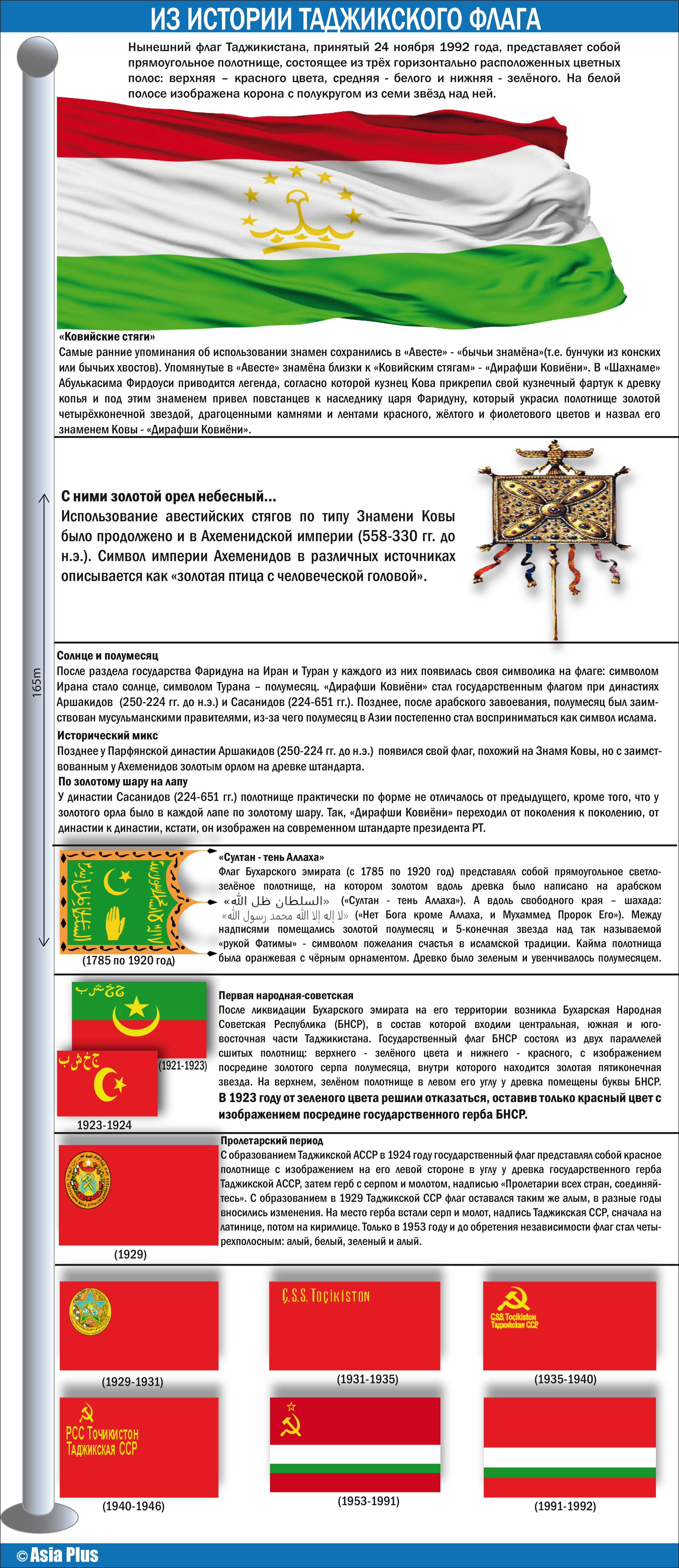 Сегодня таджикскому триколору исполняется 30 лет. За многие века главный символ государств, расположенных на месте нынешнего Таджикистана, видоизменялся много раз. Некоторые свидетельства того, какими они были, сохранились в архивах, другие живут в легендах.