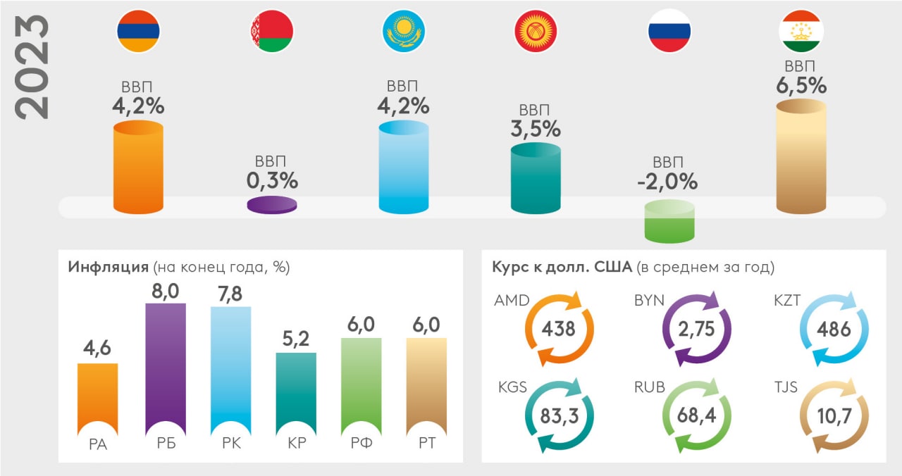 Экономикам Армении и Казахстана в 2023 году прогнозируется рост на уровне 4,2%, Кыргызстана – 3,5%, Беларуси – 0,3%, а экономике России предрекается спад на уровне -2%.