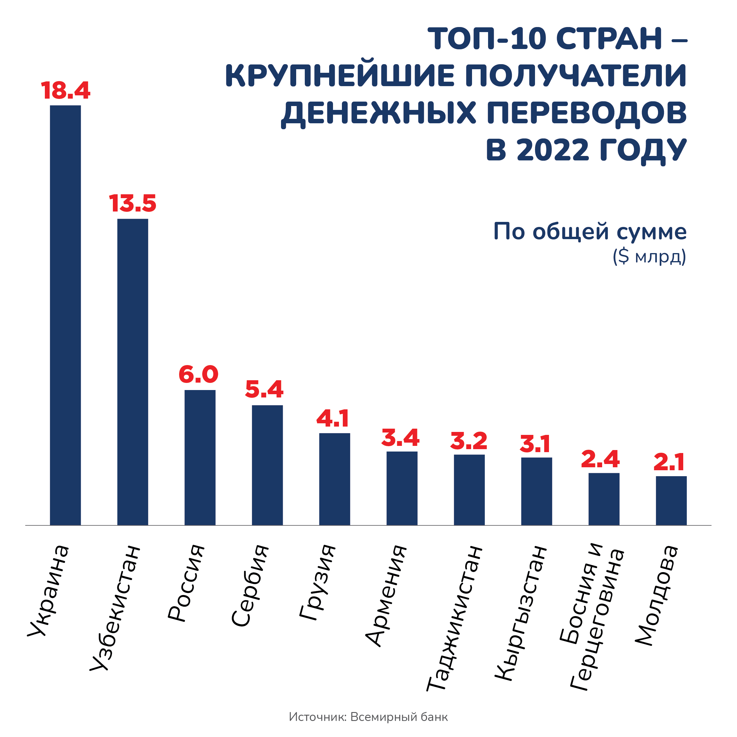 Согласно приведенным в публикации данным, приток денежных переводов в Таджикистан в 2022 году составит $3,2 млрд, Узбекистан — $13,5 млрд, в Кыргызстан — $3,1 млрд.