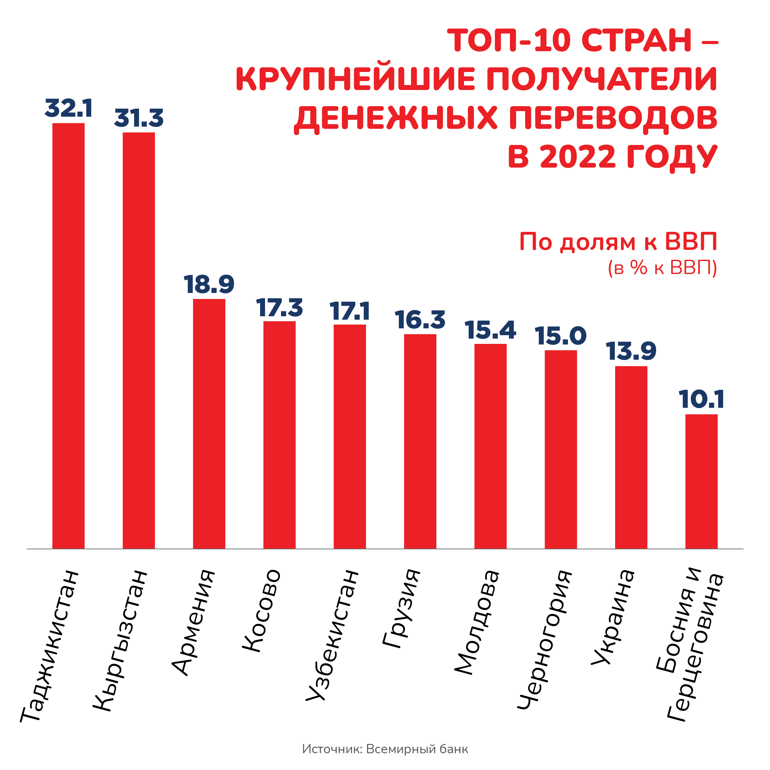 В публикации подчеркивается, что в процентном соотношении денежных переводов к ВВП лидируют Таджикистан и Кыргызстан – 32% и 31%, соответственно.