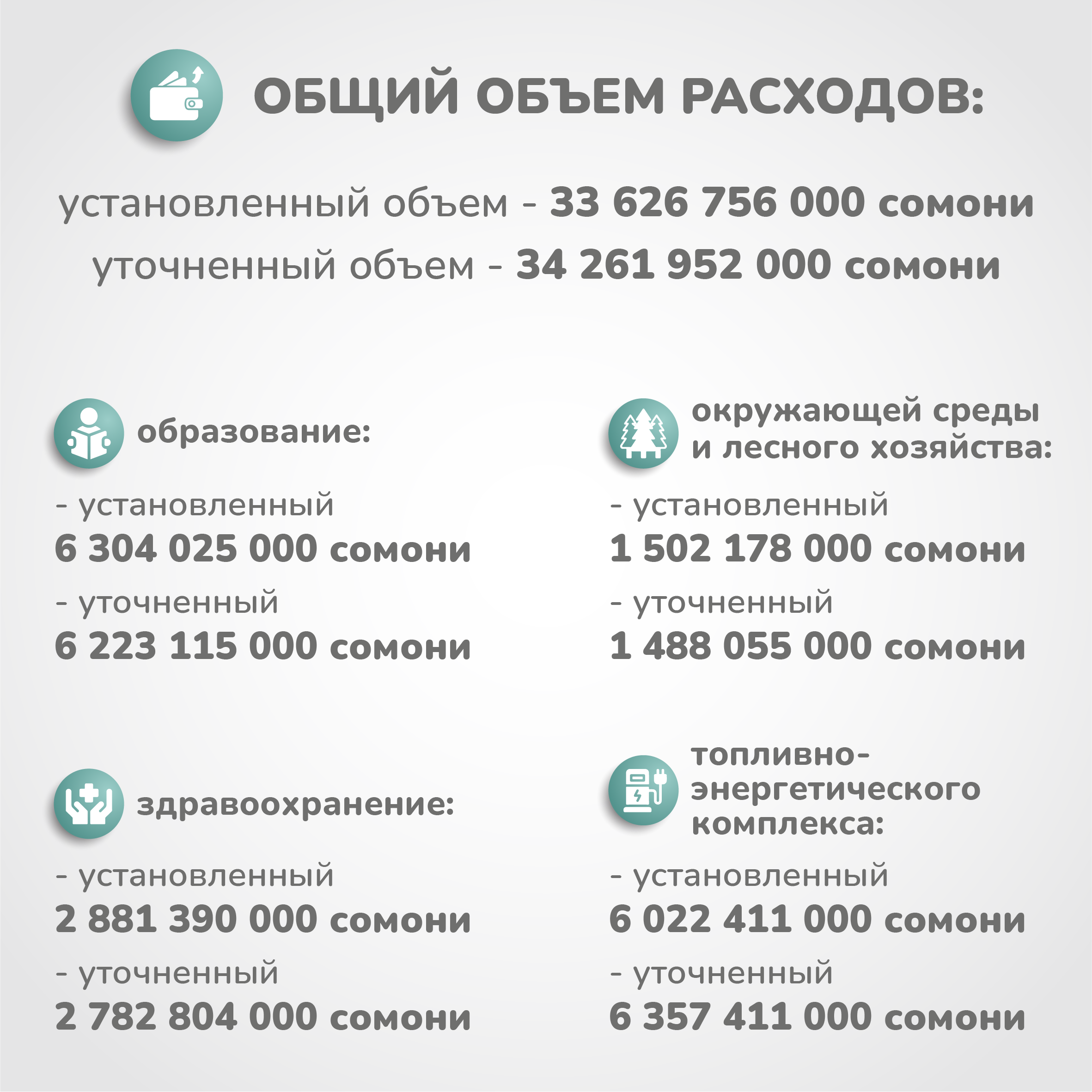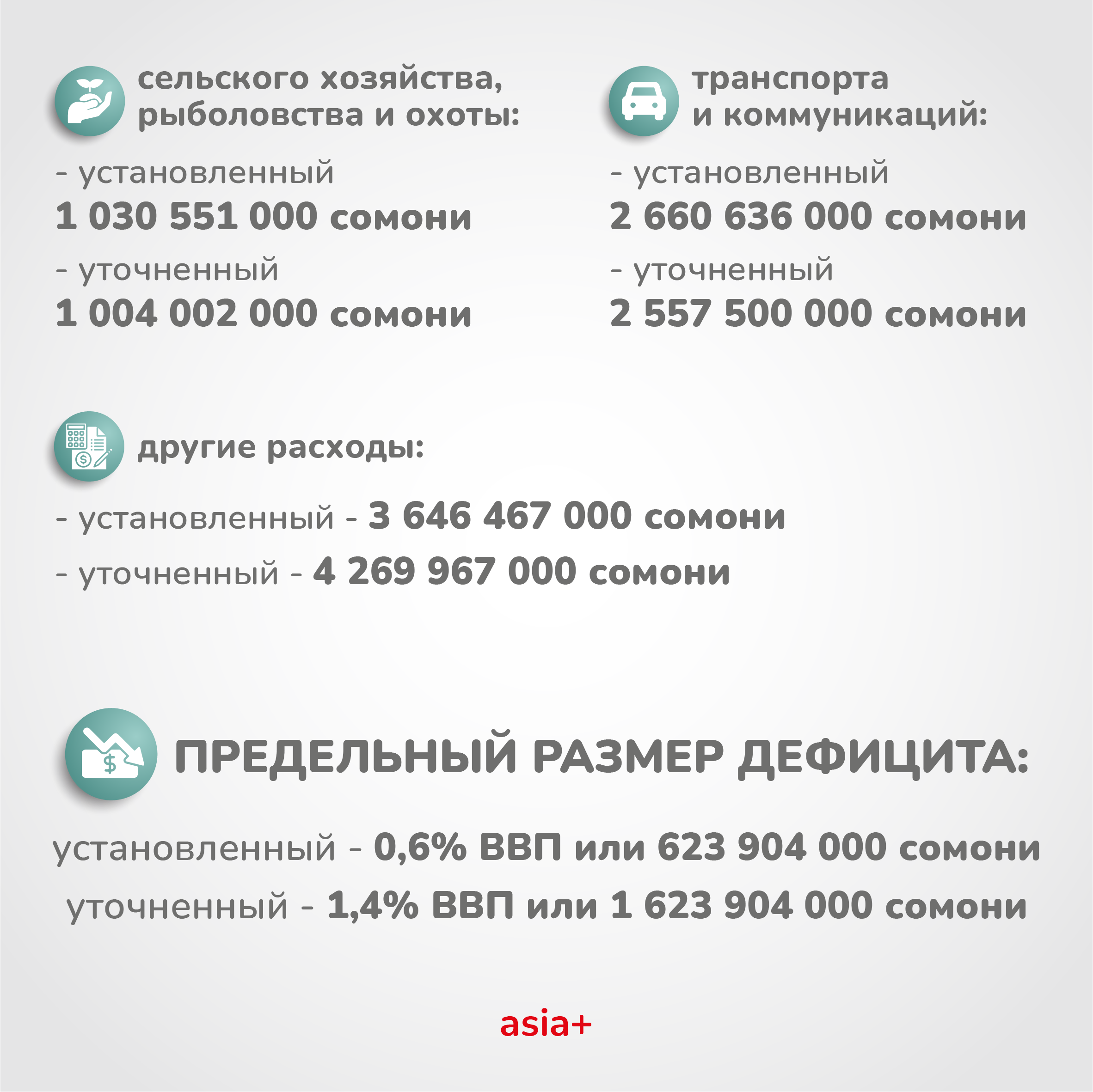 В результате объем доходной части бюджета сократился с 33 млрд сомони до 32,6 млрд сомони, а размер расходной части, наоборот, увеличился с 33,6 млрд сомони до 34,3 млрд сомони.