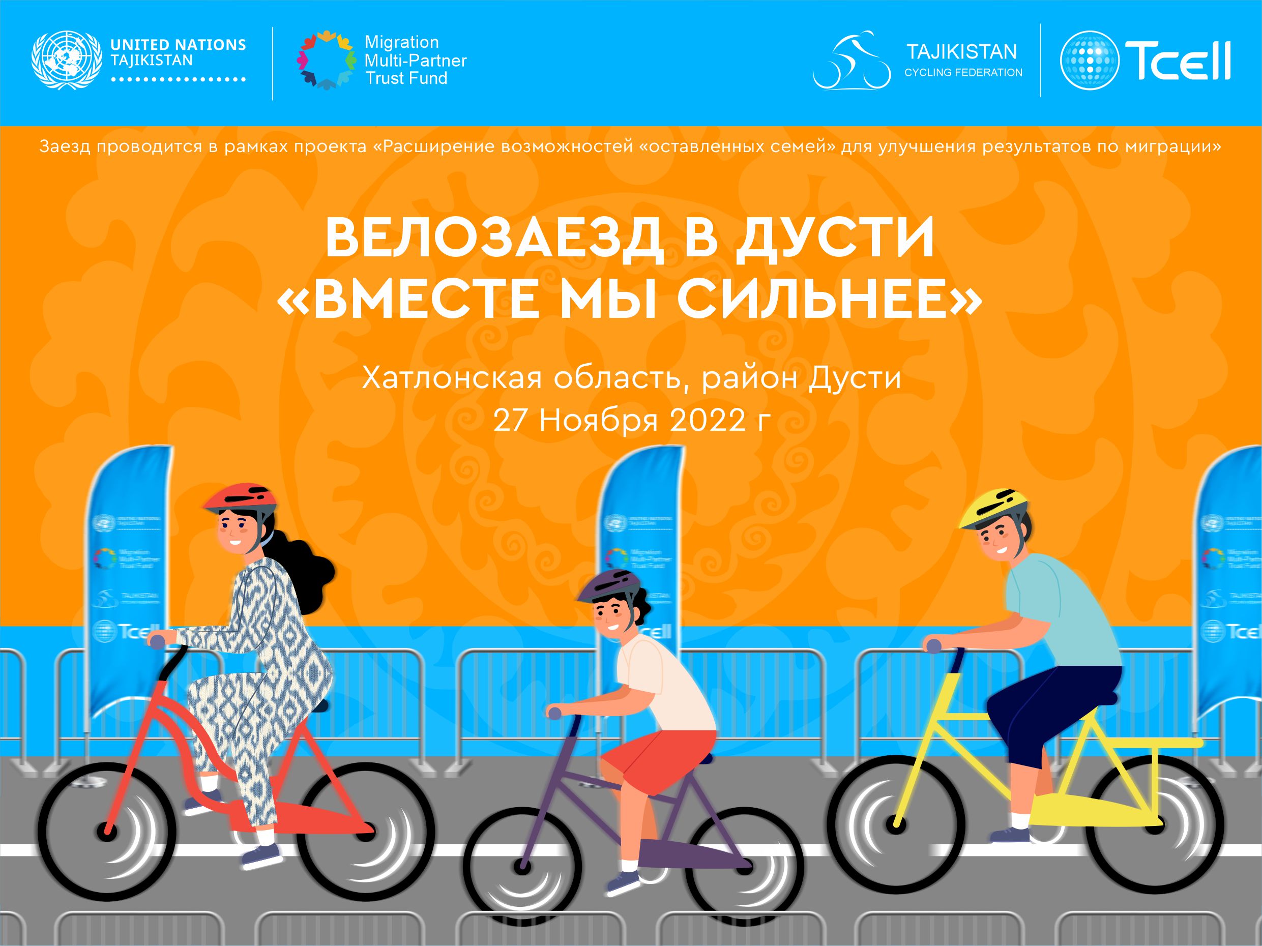 "Вместе мы сильнее" – под таким названием в городе Дусти Хатлонской области проходит велопарад. Он организован мэрией города Дусти, ООН в Таджикистане и Федерация велоспорта республики. Мероприятие прошло 27 ноября, и было посвящено 16 дням активных действий против гендерного насилия — ежегодной международной кампании, которая стартовала 25 ноября и продлится до 10 декабря – до Дня прав человека.