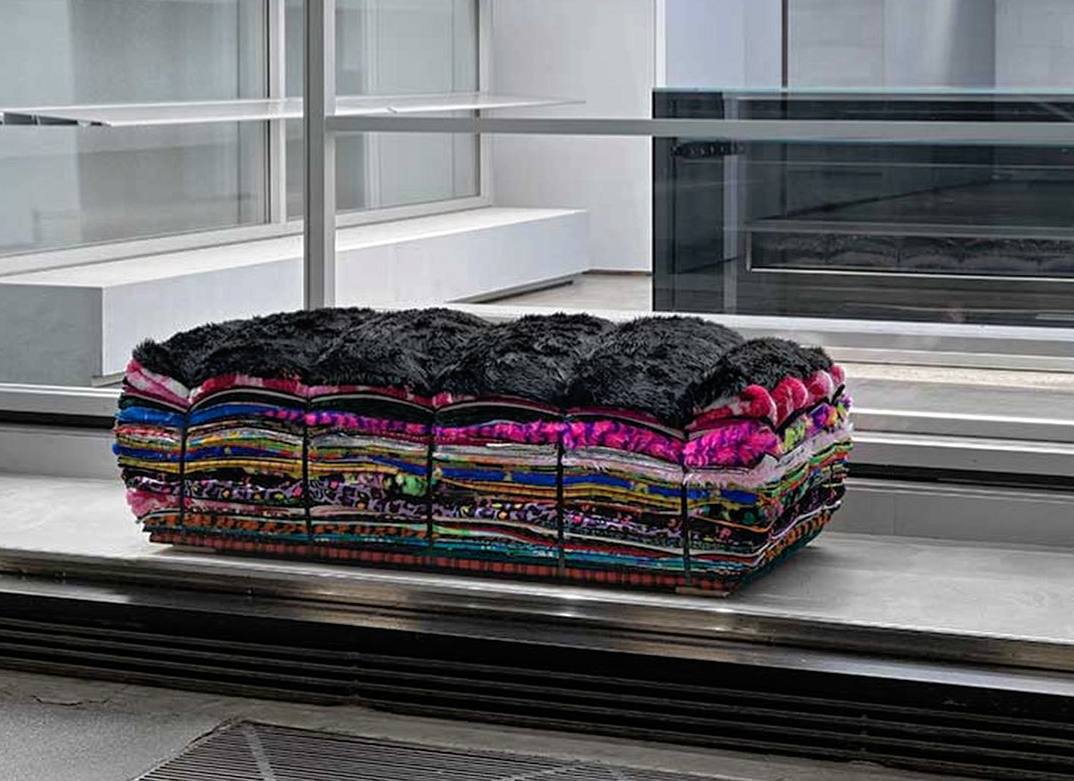 Новый эксклюзив Balenciaga представляет собой стопку сложенных друг на друга пледов разных расцветок. Согласно словам художника Тейо Реми, диван поможет ответственной утилизации и переработке тканей.