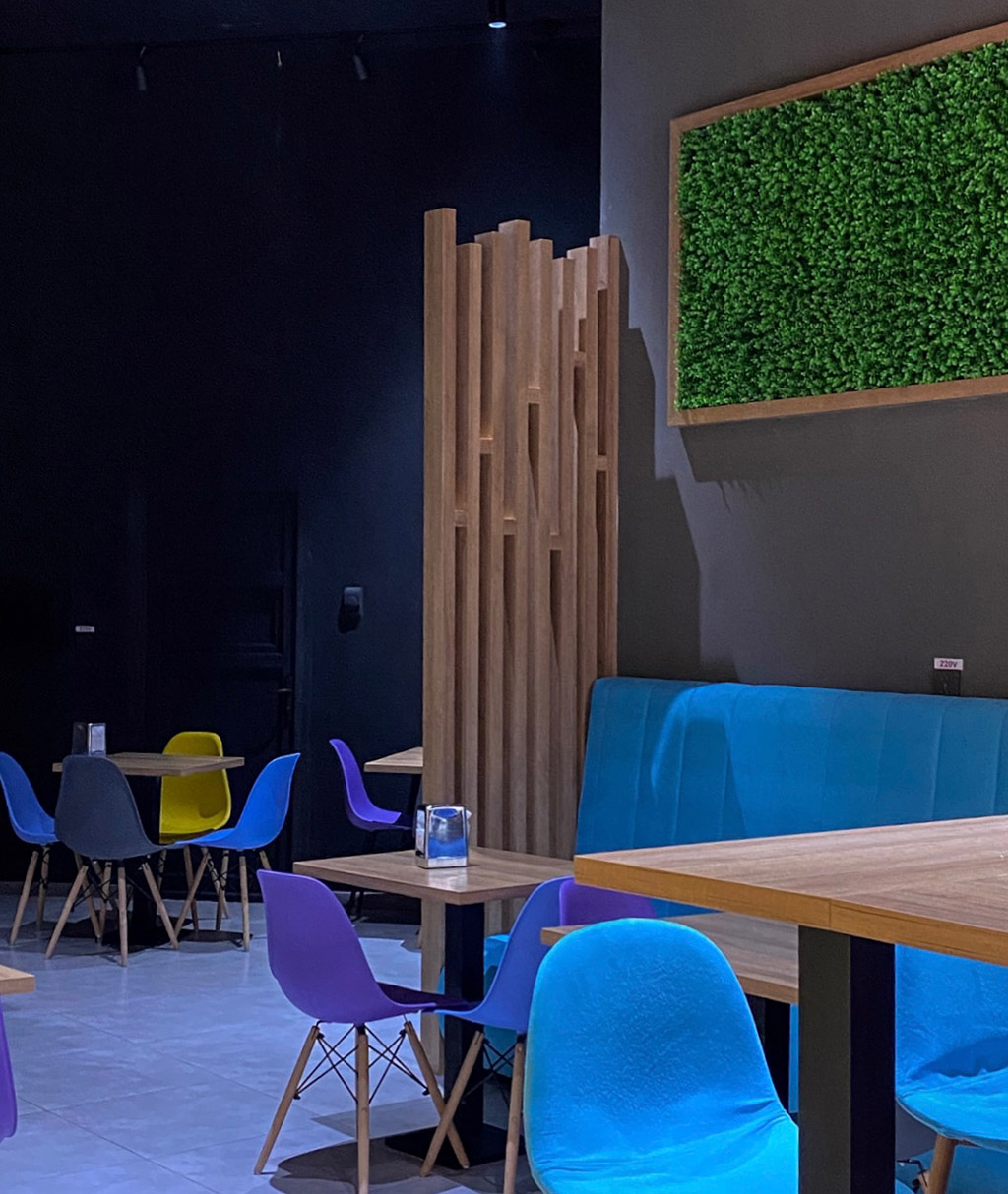 Фишка кафе заключается в ярком и красочном антураже, разнообразном меню и атмосфере уютного хоум-офиса. Интерьер кафе сделан так, что посетители не мешают друг другу, и каждый чувствует себя максимально комфортно.
