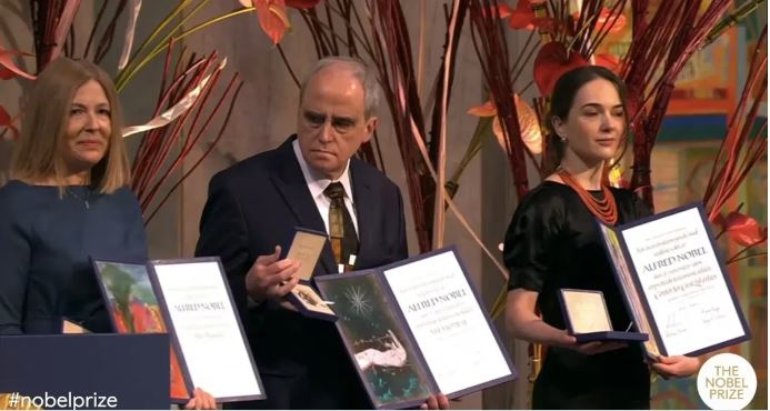 Вместо третьего лауреата премии — Алеся Беляцкого — его нобелевскую речь произнесла супруга — Наталья Пинчук