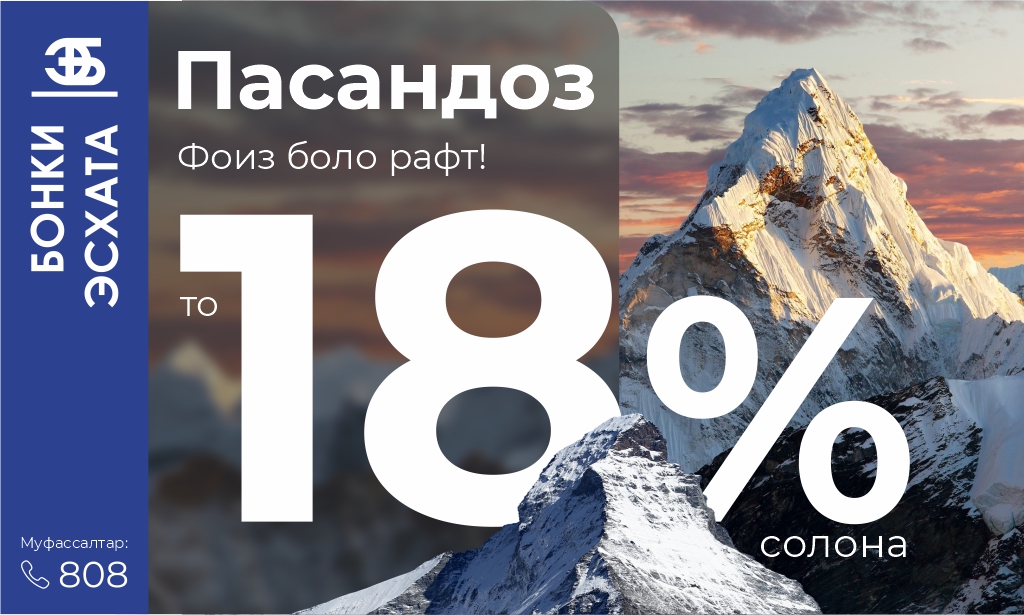 Каждый из нас хочет получать стабильный доход. Теперь появилась отличная возможность! В преддверии Нового Года, банк "Эсхата" повысил процентную ставку по срочным депозитам в сомони до 18% годовых.