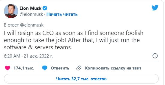 "Я уйду в отставку с поста главы, как только найду того дурака, что согласится взяться за эту работу. После этого я останусь руководить только командами по программному обеспечению и серверам", — написал Маск в комментарии к устроенному им опросу на тему, следует ли ему остаться во главе купленной им компании-соцсети.