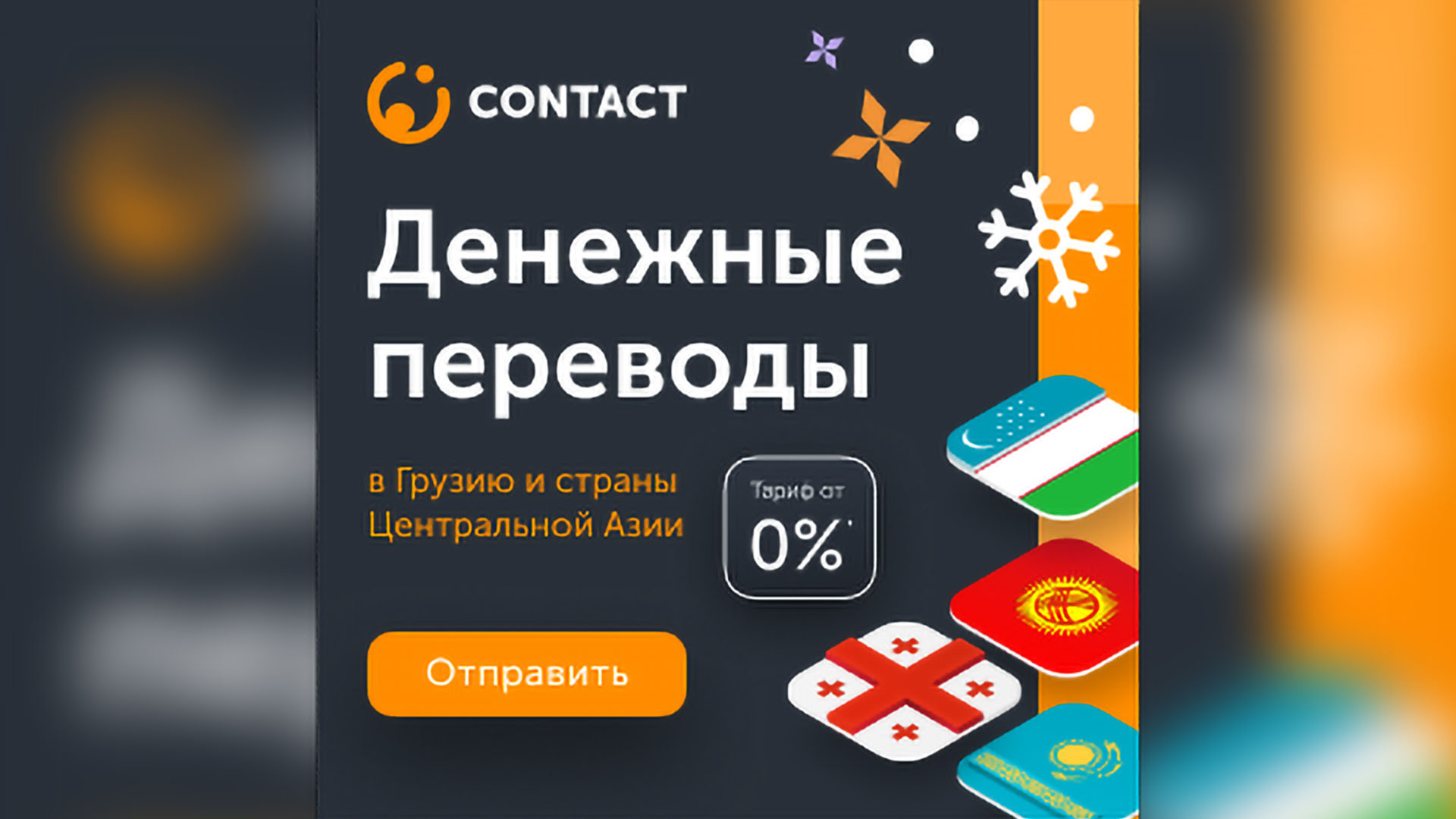 Переводите деньги родным и близким в Грузию и страны центральной Азии по системе CONTACT в отделениях, в мобильном приложении и на сайте CONTACT. На переводы, когда валюта отправки и выплаты отличаются, действует тариф 0%.
