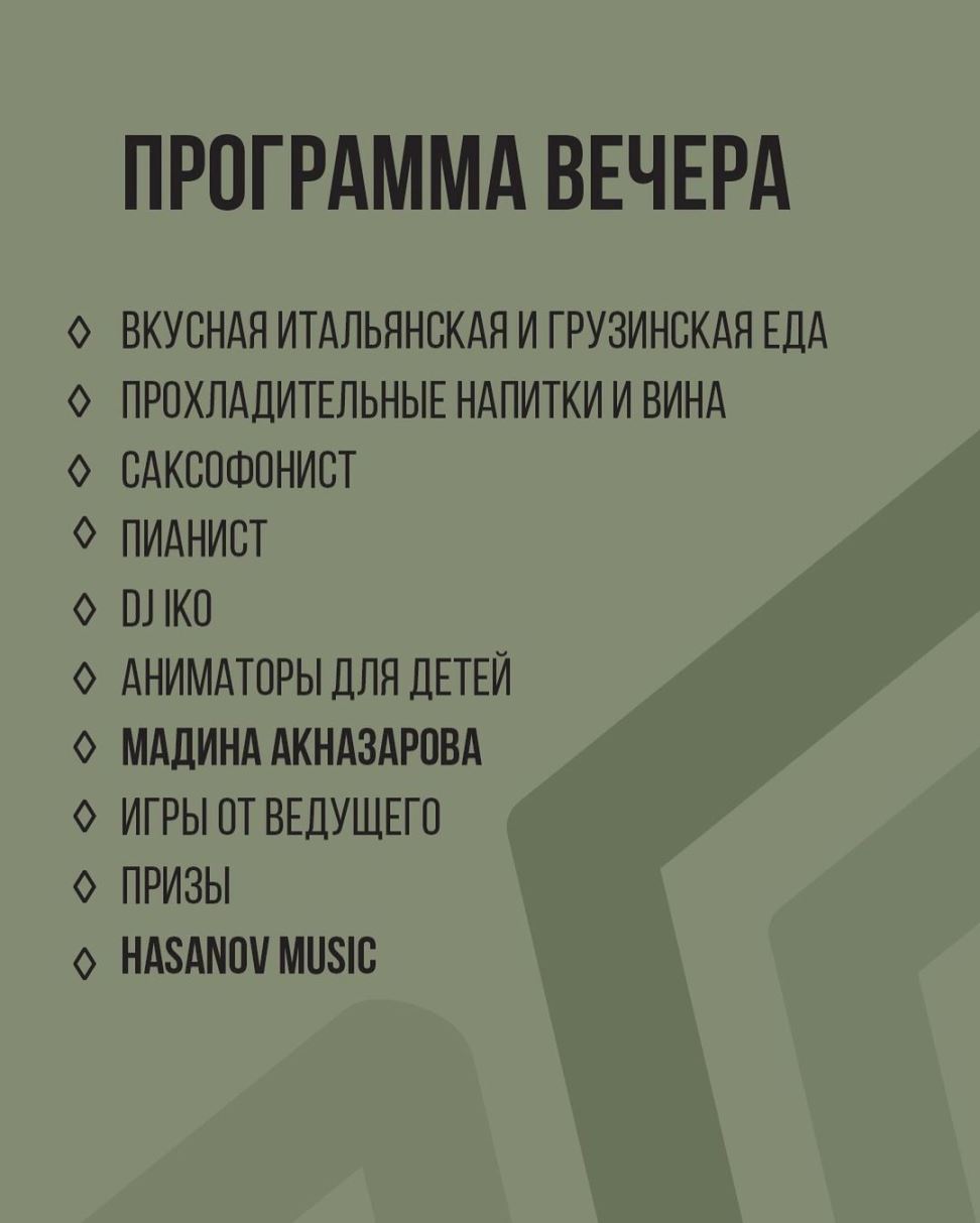 Здесь вас ждет вкусный ужин с лучшими блюдами итальянской и грузинской кухни, живая музыка, выступления Мадины Акназаровой и Hasanov Music, DJ IKO, аниматоры для детей и веселая программа с конкурсами и призами от ведущего.