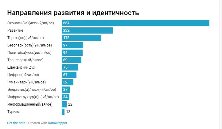 Судя по публикациям в онлайн медиа, в странах Центральной Азии существует высокий запрос в отношении ШОС для реализации экономических проектов и программ. Такие слова как экономика, развитие и торговля оказались в топе упоминаний с показателем в несколько сотен раз.