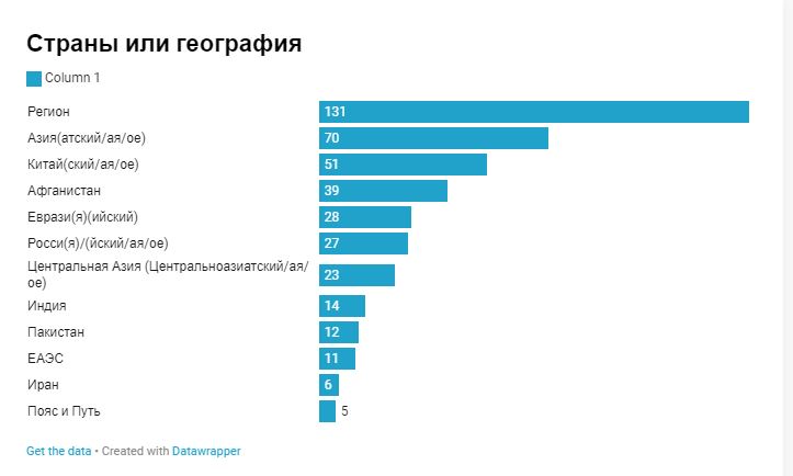 Хотя, считается, что Китай и Россия являются системообразующими странами-участницами ШОС, на лицо более частое упоминание Китая и его инициатив, заявлений, по сравнению с упоминаниями о России и российских политических лиц. Евразия упоминается достаточно часто с учетом пространства организации, а также довольно часто, пишут о Центральной Азии, по сравнению с упоминаниями о ЕАЭС.