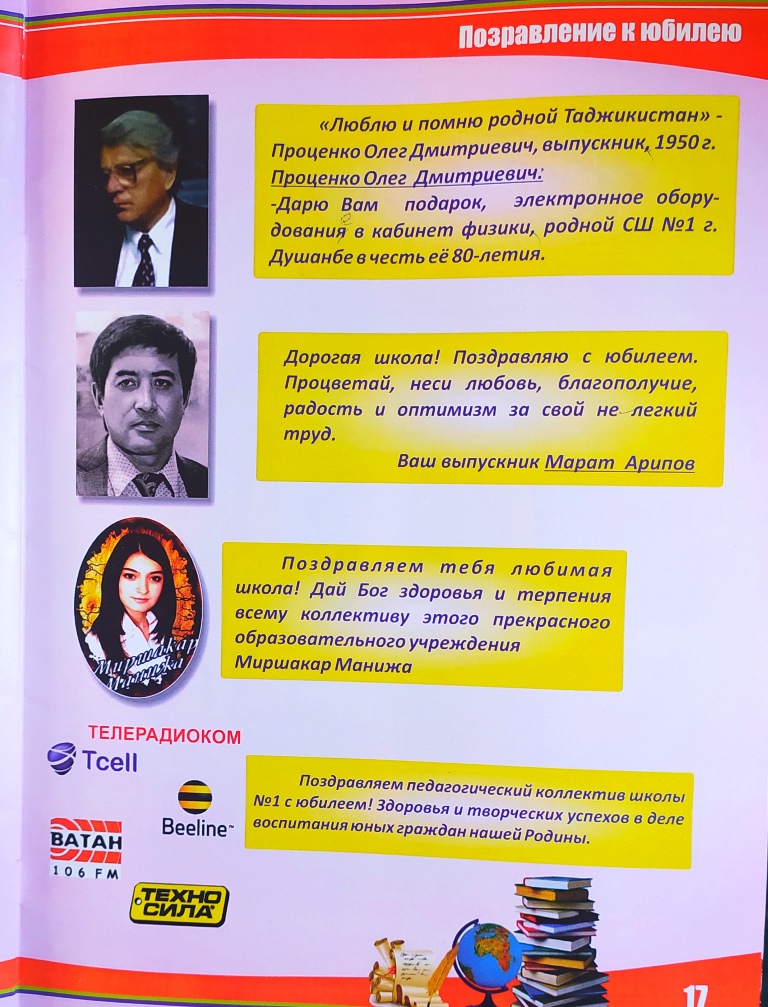 «Школа №1 всегда была многонациональной, с русским языком обучения, а с 1991 года в ней появились и таджикские классы, – говорит Абдурахмон Маликов. – В годы гражданской войны в республике она оказалась в круговороте событий и пережила тяжёлые времена. Однако при всей политической нестабильности в столице, школа продолжала работать в штатном режиме».
