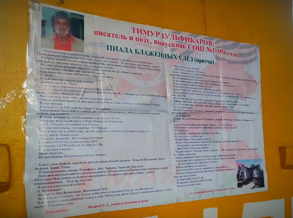 «…Нельзя убивать Прошлое… Нельзя разрушать старые дома – это все равно, что убивать стариков. Нельзя разбивать Пиалу со счастливыми слезами воспоминаний…» – так написал в своей притче «Пиала блаженных слёз» писатель и поэт, выпускник 1954 года школы №1 Тимур Зульфикаров.
